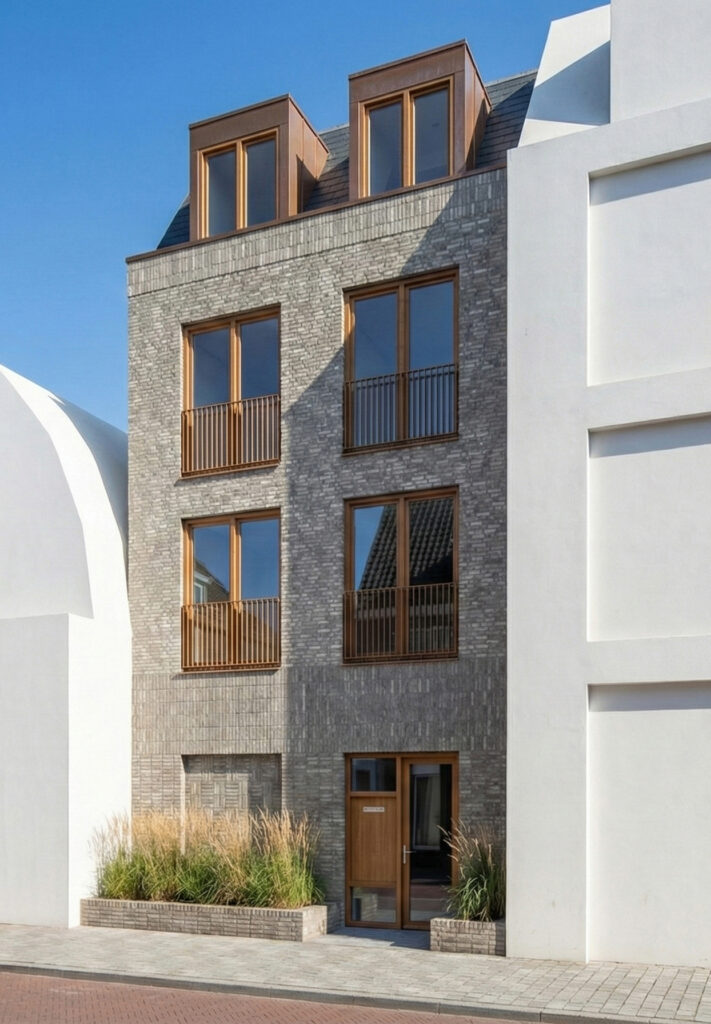 De gevels zijn opgetrokken uit genuanceerde beige baksteen in wildverband met verfijnde rollagen, geaccentueerd door aluminium kozijnen in warme tinten. De dakkapellen en het bovenste bouwdeel zijn uitgevoerd in zinkkleurig aluminium, wat het geheel een modern silhouet geeft zonder de dorpse schaal te verliezen.